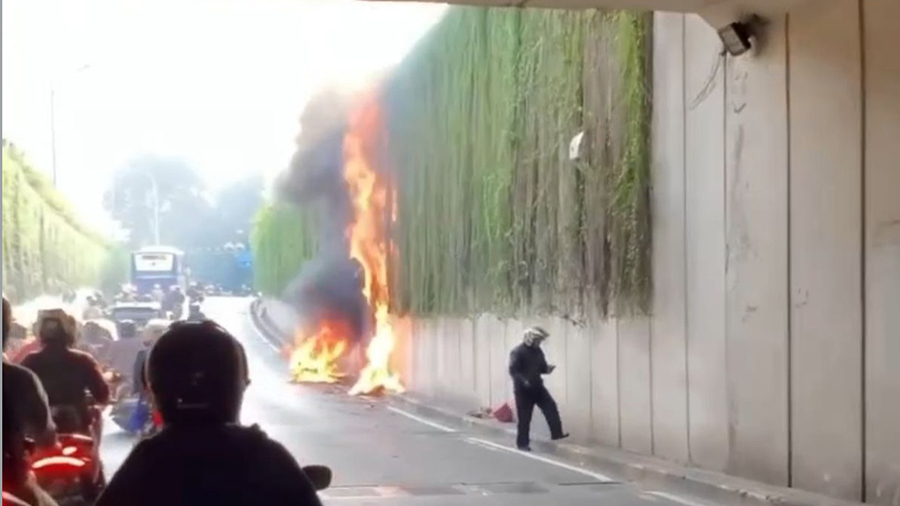 Beredar di media sosial video yang memperlihatkan sepeda motor terbakar di underpass Kebayoran Lama, Jakarta Selatan, Senin (12/6/2023). Dalam rekaman terlihat sepeda motor yang habis terbakar dan seorang pria yang merupakan pemiliknya sedang berdiri di sebelahnya.